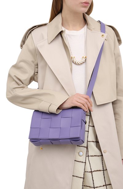 Сумку Cassette сплели в фирменной технике intrecciato из широких полос кожи ягненка, а внутри предусмотрели карман на молнии. Аксессуар с регулируемым плечевым ремнем закрывается клапаном на магните.