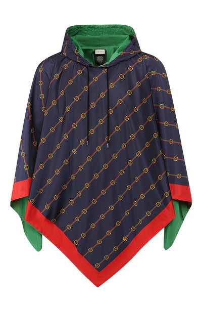 Узкая диагональная полоска на этом пончо объединила в себе знаковую для вещей бренда, основанного Гуччио Гуччи, двухцветную ленту Web и изображение стремени. Темно-синюю модель с капюшоном и широким алым кантом можно вывернуть и носить однотонной зеленой стороной наружу. Изделие из весенне-летней коллекции сшито из легкого непромокаемого нейлона.