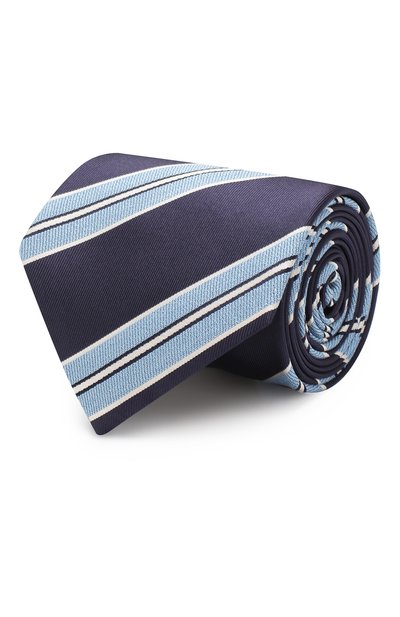 Мастера марки сшили галстук из фактурного шелка с мотивом в виде диагональных полос трех оттенков: насыщенного синего, голубого и белого. Материал почти не мнется и не пачкается, поэтому изделие будет выглядеть свежим в течение всего дня. Эффектно такой аксессуар смотрится на фоне светлой однотонной рубашки.