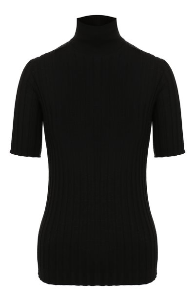 Черная водолазка из осенне-зимней коллекции – беспроигрышный вариант, который подружится со всеми вещами, будь то джинсы, юбка или брючный костюм. Модель с короткими рукавами выполнили фактурной вязкой из тонкой мериносовой шерсти (материал в три раза мягче натурального шелка и в пять раз эластичнее хлопка). Чтобы вещь лучше держала форму, в пряжу добавили прочные нейлоновые волокна.