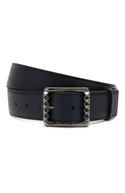 Мастера марки выполнили темно-синий ремень из прочной фактурной кожи с матовым блеском. По длине изделие регулируется крупной пряжкой из полированного металла с рутениевым покрытием. Квадратная застежка украшена шипами-пирамидами, знаковыми для бренда.