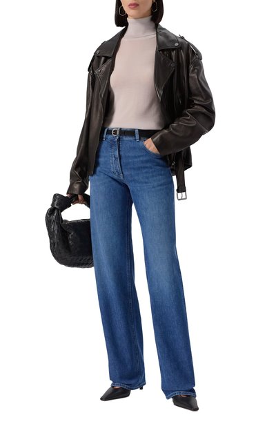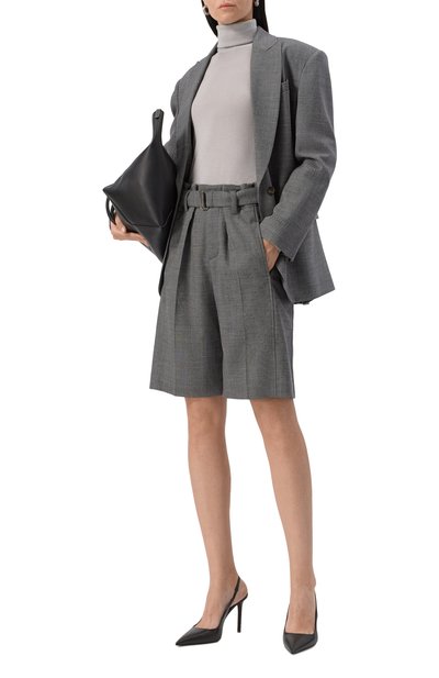 Водолазку с манжетами и поясом в рубчик сшили из кашемирового трикотажа с добавлением шелка и металлизированных нитей. Деликатно блестящую модель оставили без декора.