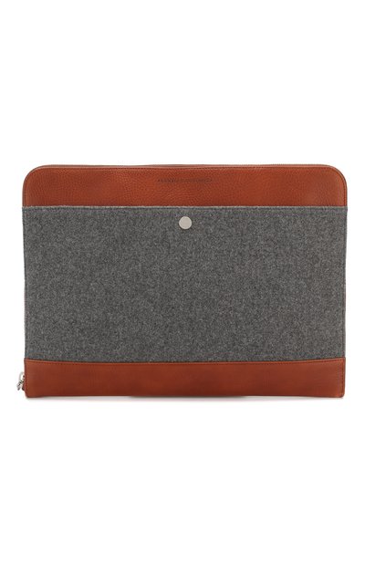 При создании папки для документов формата А4 дизайнеры сделали ставку на практичность: для изготовления аксессуара использовали комбинацию прочного фактурного войлока, который легко очищается от загрязнений, и матовой зерненой кожи, устойчивой к царапинам и повреждениям. Изделие застегивается на молнию, внешний объемный карман — на серебристую кнопку с выгравированным логотипом марки.