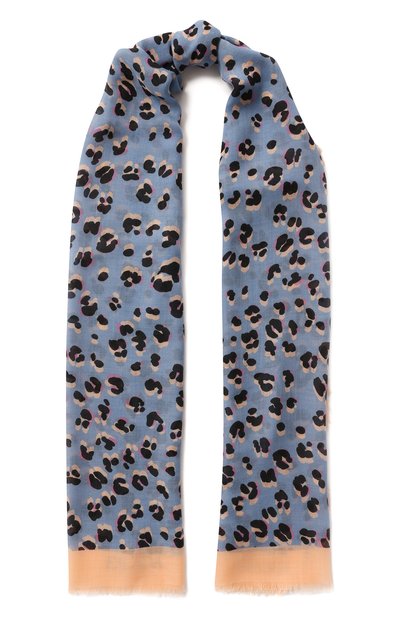 Леопардовый принт, один из главных трендов 1990-х, на шарфе нежного голубого цвета заиграл новыми красками. На этот раз дизайнеры марки выбрали для анималистичного мотива черный, розовый и персиковый оттенки. Длинный аксессуар с короткой бахромой по краям выполнен из тонкого, приятного на ощупь кашемира.