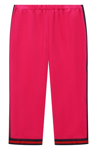 Ярко-розовые брюки с поясом-резинкой надолго сохранят первоначальный внешний вид: все дело в материале. Мастера марки изготовили модель из прочного плотного хлопка с бархатистой фактурой. Он хорошо держит форму и не вытягивается на коленях. Лампасы и манжеты составили из ленты Web (использовали сине-красный ее вариант).