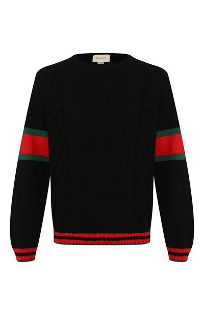 На создание черного свободного пуловера из осенне-зимней коллекции Алессандро Микеле вдохновила одеж да студентов Лиги Плюща. Модель с объемными арановыми узорами связали из мягкой шерстяной пряжи, которая хорошо удерживает тепло. Длинные рукава, манжеты и низ украсили полосами в цветах знаковой ленты Web, отсылающей к наследию бренда.