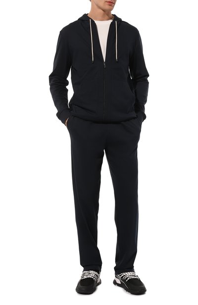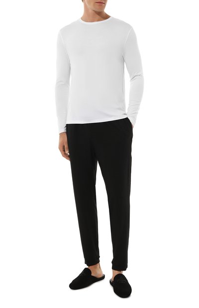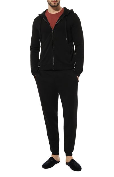 Для создания черных джоггеров мастера марки использовали гладкий шелковистый микромодал. Изделие из такого материала поддерживает оптимальную для тела температуру, а за счет волокон эластана в составе вещь не сковывает движения, поэтому в ней будет комфортно во время отдыха. Модель с парой врезных боковых карманов дополнили регулируемым поясом-кулиской.