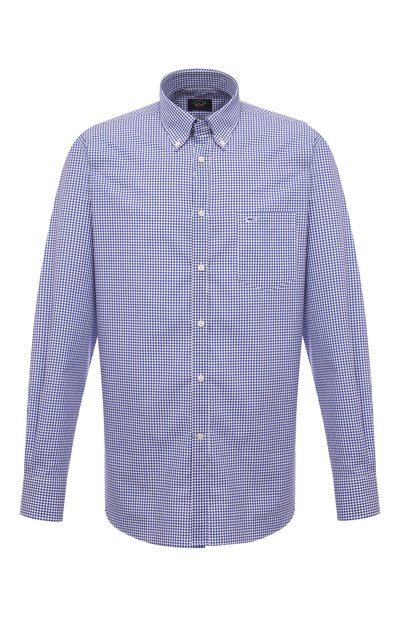 Синяя сорочка с длинными рукавами и воротником button down изготовлена из тонкого гладкого хлопка в клетку. На груди — накладной карман с вышитой эмблемой марки. Легкая модель вошла в осенне-зимнюю коллекцию. Советуем носить с темным жилетом и брюками, дополнив образ белыми кедами.