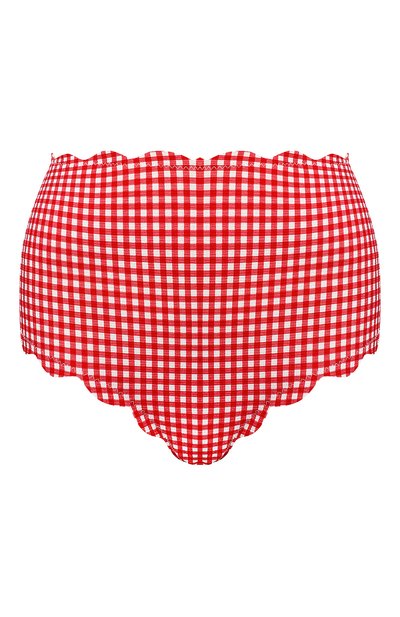 Красные клетчатые плавки выполнены из фактурного стрейчевого материала, который быстро сохнет и не теряет цвет как в морской, так и в хлорированной воде. Бикини с завышенной посадкой, формирующей силуэт, украсили крупными фестонами.