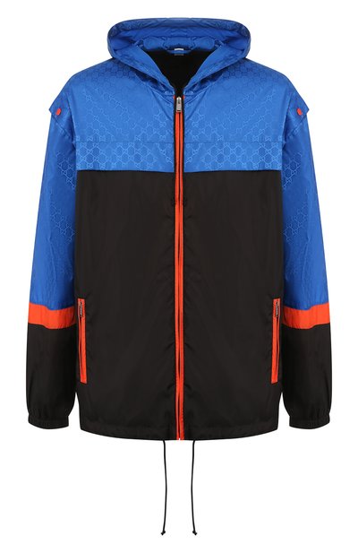 Куртка из осенне-зимней коллекции — модель 2-в-1: отстегивающиеся рукава позволяют носить ее как жилет. Для создания изделия, выполненного в технике color block, Алессандро Микеле выбрал ярко-синий жаккард с фирменным GG-паттерном и гладкий матовый нейлон черного и оранжевого цветов. Эти прочные, но легкие ткани делают вещь незаменимой для прогулок в непогоду.