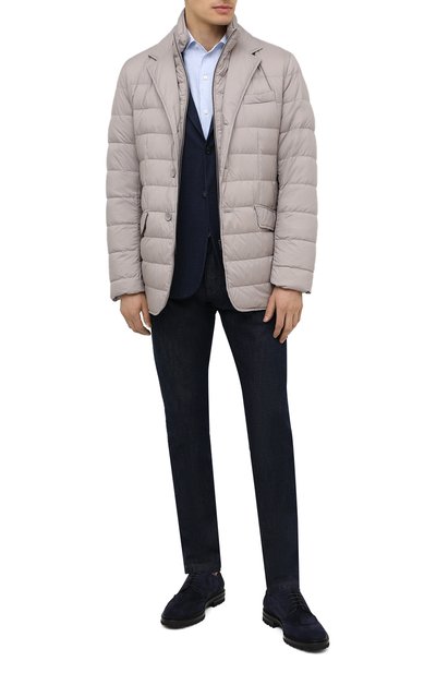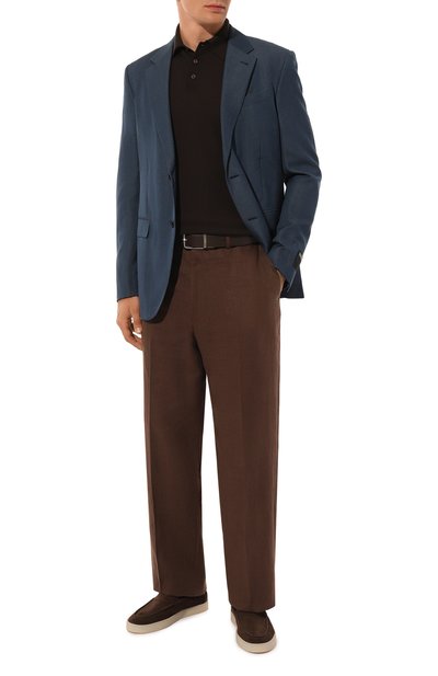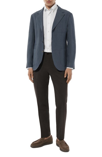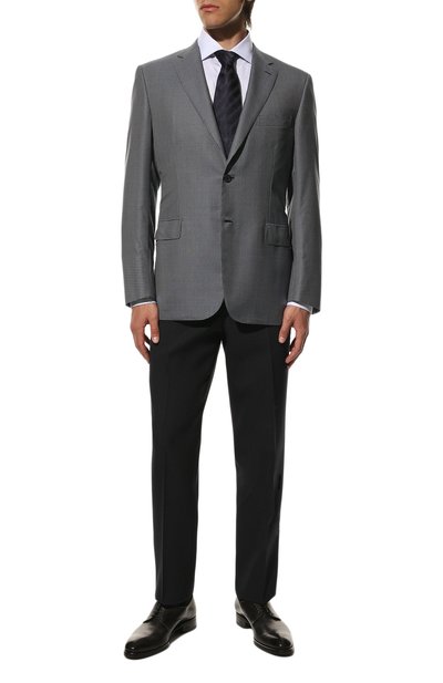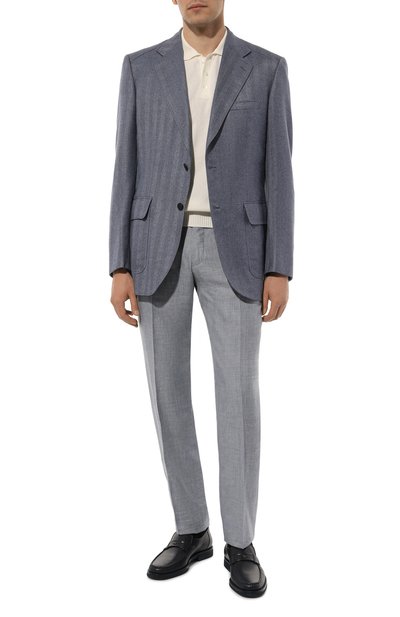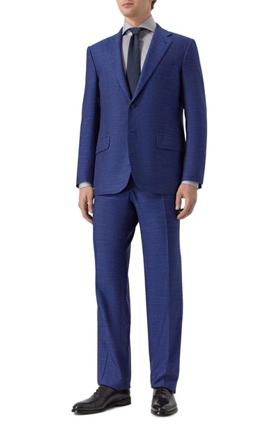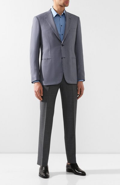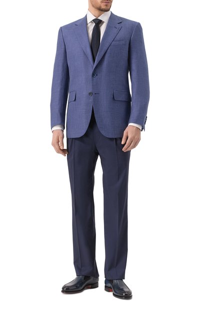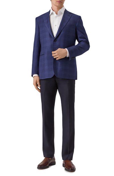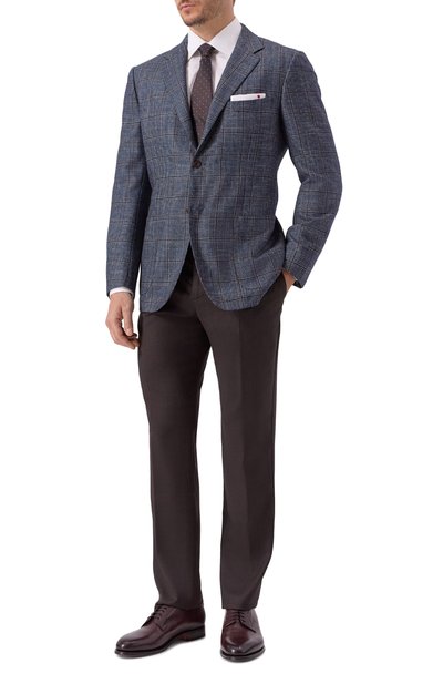 Изделия марки отличает исключ ительный уровень конструирования и обработки деталей. Тому подтверждение - этот синий однобортный пиджак из коллекции сезона осень-зима 2019 года. Мастера марки сшили приталенную модель вручную из мягкой шерстяной ткани с микроузором пье-де-пуль. Образ для офиса с нестрогим дресс-кодом поддержат темно-серые брюки, голубая рубашка и коричневые дерби.