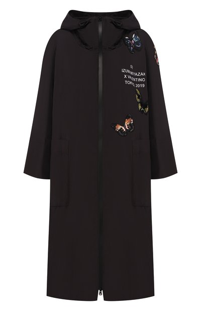 Капсульную коллекцию Valentino TKY Пьерпаоло Пиччоли создал совместно с Изуми Миядзаки. Японский фотограф придумала яркие принты в виде портретов: таким украсили и свободный черный плащ (декор поддерживает вышивка в виде знаковых для бренда, основанного Валентино Гаравани, бабочек). На показе модель из непромокаемого нейлона сочетали с платьем и сапогами, а мы предлагаем носить с джинсами и босоножками.