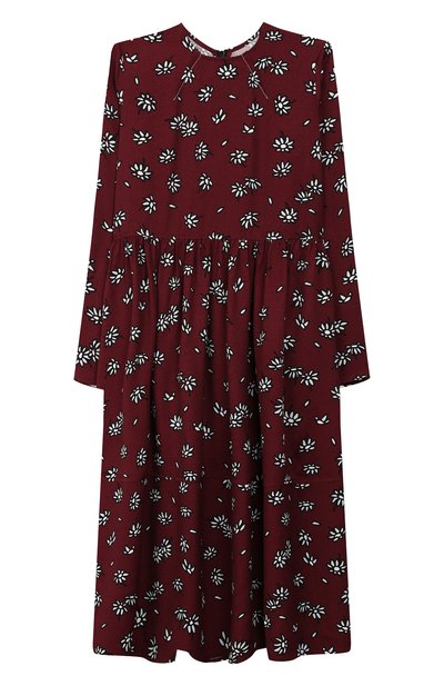 Платье оттенка спелой вишни выполнили из прочного вискозного крепа, который почти не мнется. На фоне насыщенного цвета гармонично смотрится белый растительный мотив, а романтичное настроение узора поддержали, собрав материал в мягкие складки у пояса. Модель с длинными рукавами застегивается потайной молнией сзади.