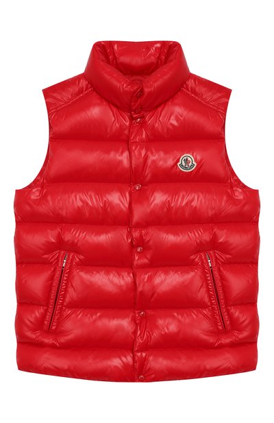 Ярко-красный жилет из прочного полуглянцевого полиамида не боится дождя и порывов ветра, а за счет легкой пухо-перьевой прослойки хорошо сохраняет тепло. Левую полочку украсили небольшой фетровой эмб лемой бренда. Стеганая модель с двумя боковыми карманами и с воротником-стойкой застегивается на молнию, скрытую под планкой с кнопками.