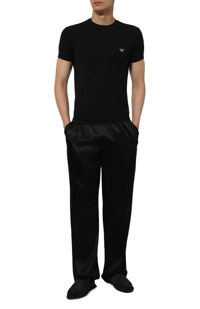 Мастера марки сшили черную футболку из плотного джерси, в котором привычный хлопок заменили модалом. Он хорошо пропускает воздух и отводит влагу, но выигрывает в мягкости и эластичности. В комплект входит вторая модель с белым узором в виде логотипа бренда на спинке.
