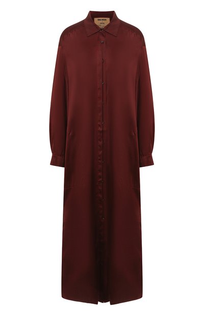 Даже длина не мешает платью-рубашке из тонкого, приятного на ощупь эластичного шелка оставаться образцом минимализма. Единственный декор модели сочного бордового оттенка — два высоких боковых разреза. Ума Ванг включила изделие со спущенными рукавами в коллекцию сезона осень-зима.