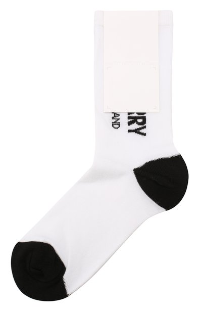 Для создания белых носков мастера марки использовали мягкий хлопковый трикотаж, который не раздражает кожу, пропускает воздух и отводит влагу. Чтобы изделие служило дольше и хорошо держало форму, в состав нитей добавили эластичные нити и прочный полиамид. Модель украсили контрастным жаккардовым логотипом бренда.