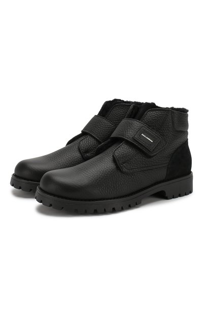 Ботинки выполнили из крупнозернистой кожи, с которой контрастирует замшевая накладка на заднике. Утепленную мягкой овчиной модель дополнили ремешком с застежкой велкро. Благодаря подошве с глубоким протектором обувь почти не скользит.