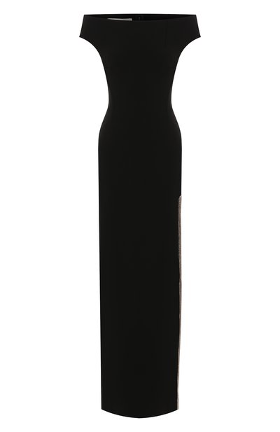 Черному приталенному платью из осенне-зимней коллекции не нужны аксессуары, чтобы оставаться в центре внимания. Заявить о себе позволяют открытая линия плеч и высокий разрез, который Стелла Маккартни подчеркнула широким кантом из прозрачных кристаллов и золотистого бисера. Такой декор особенно эффектно смотрится на фоне плотной матовой ткани.
