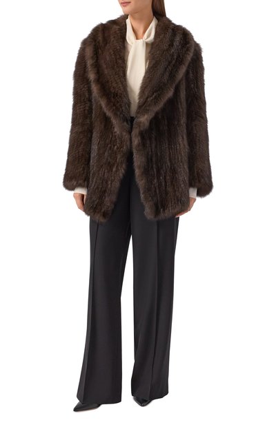Мастера марки славятся своим искусным обращением с мехом и эта шуба из коллекции сезона осень-зима — хороший пример. В модели скомбинировали шелковистый мех норки двух тонов: коричневого с уникальными переливами и кремового. Последний использовали для изготовления воротника и полос. Их со скрупулезной точностью вставили в рукава, создав ощущение единого полотна. Приталенный силуэт поможет сформировать пояс.