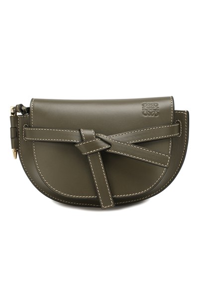 В сумке Gate у всего есть скрытые смыслы: форма повторяет очертания седла, боковой штифт дал ей название, а завязанная лента не только декор, но и фиксирует клапан. Поясной аксессуар из осенне-зимней коллекции марки, основанной Энрике Лоэве, создали вручную из гладкой кожи цвета хаки. Изделие можно носить как клатч, сняв ремень.