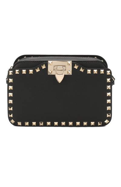 Аксессуары из линии Rockstud традиционно украшают шипами-пирамидами. Не стала исключением и эта небольшая черная модель из осенне-зимней коллекции бренда, основанного Валентино Гаравани: здесь выбрали элементы с платиновым напылением. При пошиве изделия мастера марки использовали прочную плотную кожу с легким матовым блеском. В главное отделение поместятся смартфон, картхолдер и помада.