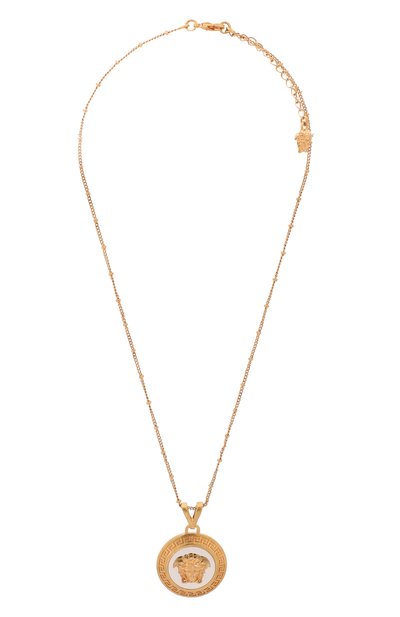 К созданию кулона подошли с типичным вниманием к ключевым спецэффектам марки. На серебристой подложке разместили объемное изображение головы горгоны Медузы в обрамлении меандровой ленты. Аксессуар из позолоченного ювелирного сплава дополнили регулируемой по длине цепочкой мелкого панцирного плетения.