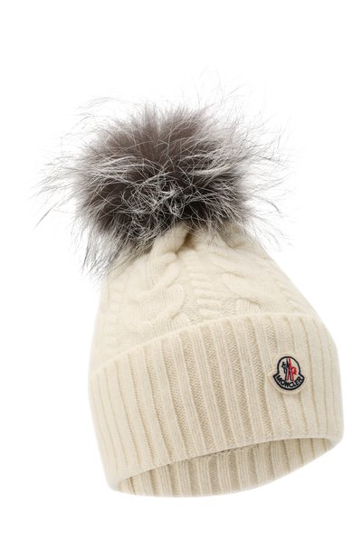 Шапка кремового оттенка выполнена из мягкой шерстяной пряжи с добавлением тонких волокон кашемира. Аксессуар с рельефными арановыми узорами украшен пушистым серым помпоном из меха лисы. На широкой эластичной манжете ‒ небольшой фирменный патч с символикой марки.