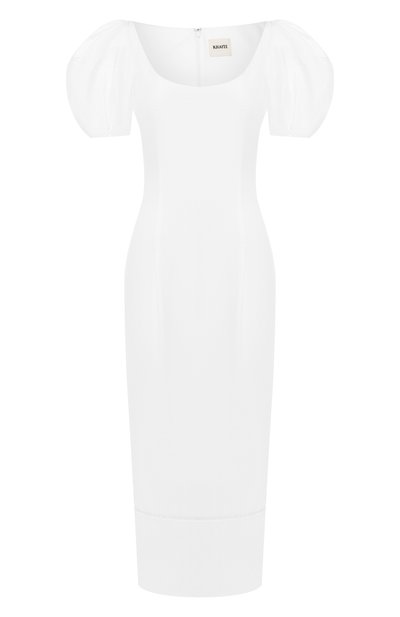 В осенне-зимней коллекции дизайнеры марки экспериментировали с объемами и играли на контрасте фактур. Яркий пример — облегающее белое платье из плотного хлопкового твила, дополненное воздушными короткими рукавами-фонариками. Модель с высоким разрезом и тонкой кружевной полоской на подоле застегивается сзади на потайную молнию.