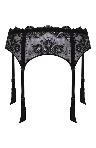 Черный пояс для чулок выполнили из мягкого прочного кружева Leavers, которое вручную плетут на старинных станках, создавая цветочные узоры. Широкие регулируемые пажи из гладкого атласа обеспечивают идеальную посадку.