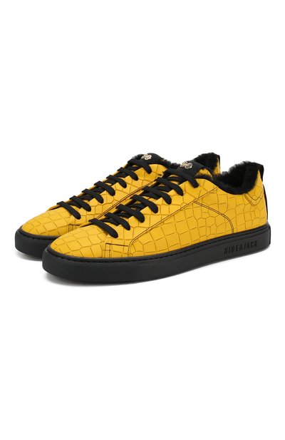 В осенне-зимнюю коллекцию вошли горчично-желтые кеды на контрастной черной подошве. Модель выполнили из прочного непромокаемого нубука с тиснением под рептилию. За сохранение тепла здесь отвечае т подкладка из густой стриженой овчины, поэтому в такой обуви будет комфортно в прохладную погоду.