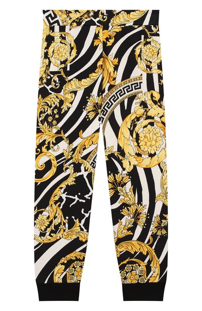 Для создания разноцветных джоггеров использовали мягкий эластичный трикотаж с принтом Savage Barocco (в ярком рисунке объединили знаковый для бренда орнамент и анималистический мотив). Материал на основе длинноволокнистого хлопка хорошо пропускает воздух и поддерживает оптимальную температуру. За комфортную посадку отвечает широкий плоский пояс, который не впивается в тело и не перекручивается.