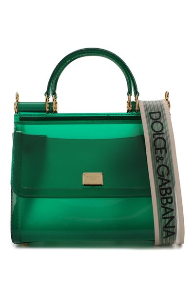 В коллекции сезона осень-зима Доменико Дольче и Стефано Габбана отошли от традиционного подхода к выбору материалов. Вместо привычной кожи для создания сумки Sicily насыщенного зеленог о оттенка использовали прочный легкий полимер. В комплекте – широкий текстильный ремень, украшенный логотипом бренда.