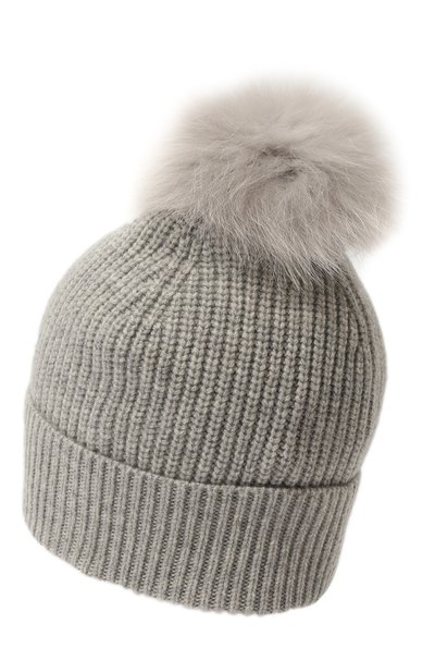 Шапку выполнили эластичной вязкой из кашемировой пряжи. Аксессуар с широким отворотом декорировали помпоном из меха лисицы, окрашенного в тон.