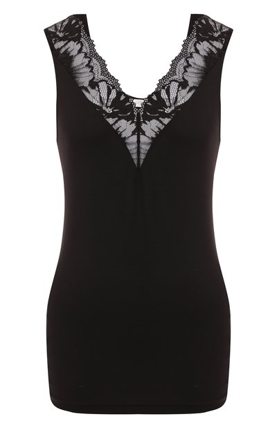 Для создания черной майки мастера марки использовали тонкий легкий трикотаж на основе эластичного микромодала и гладкого шелка. Благодаря такому составу материал не теряет форму и не пилингуется после стирок. Глубокий V-образный вырез подчеркнули полупрозрачным кружевом Leavers, сплетенным вручную на старинных станках.