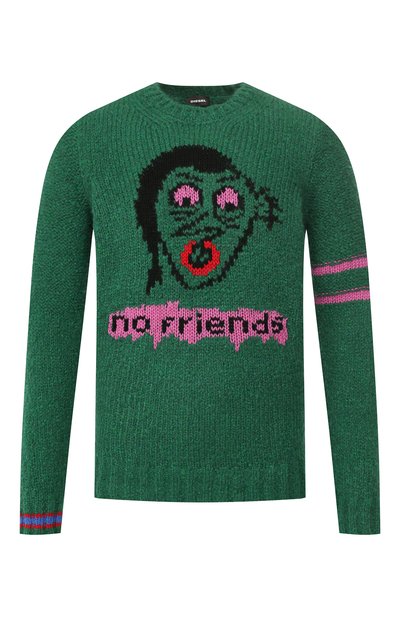 Зеленый свитер с узором в виде стилизованного портрета и надписью «No friends» поможет выделиться из толпы в любой обстановке. За это отвечают в том числе широкие разноцветные полоски и патч с логотипом марки сзади. Модель из коллекции сезона осень-зима связана вручную из плотной, но при этом мягкой полушерстяной пряжи. За счет синтетических волокон в составе материала изделие не вытягивается со временем и не пилингуется.