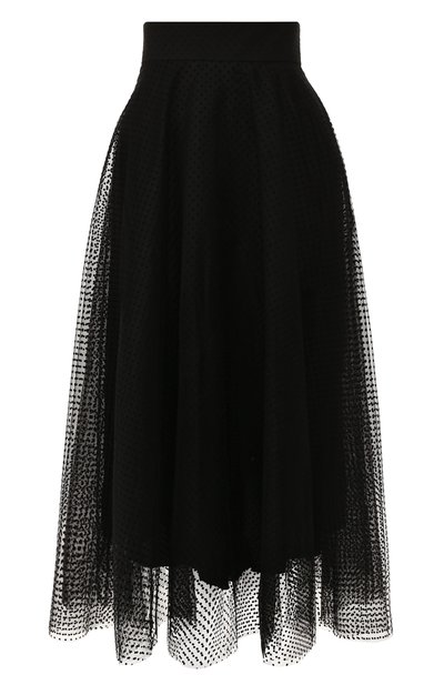 Черная пышная миди-юбка из осенне-зимней коллекции выведет на новый уровень даже лаконичный пуловер, но наши стилисты предлагают более романтичное сочетание — с водолазкой, похожей на блузу. Для изготовления модели с широким поясом Ники Циммерманн выбрала полупрозрачный легкий тюль с флокированным горо ховым мотивом. За счет подкладки из шелковистой вискозы в изделии будет особенно комфортно.