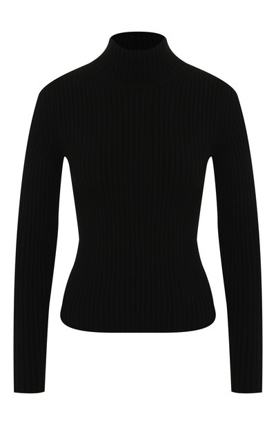 Черный пуловер из осенне-зимней коллекции станет хорошим вложением в базовый гардероб. Для пошива модели с высоким воротником мастера марки, основанной Кристобалем Баленсиагой, использовали мягкий полушерстяной трикотаж с фактурным полосатым узором. Образ поддержат брюки и туфли в тон, а также красная сумка.
