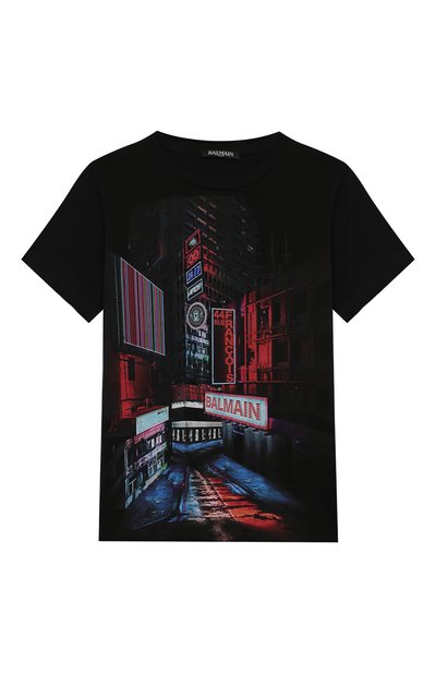 Черную футболку выполнили из мягкого хлопкового джерси. Приятный на ощупь материал хорошо пропускает воздух, отводит лишнюю влагу и почти не мнется. Изделие декорировали ярким принтом, вдохновленным уличной рекламой. Похожая модель есть в мужской коллекции бренда, поэтому вещь подойдет для составления образов в стиле family look.