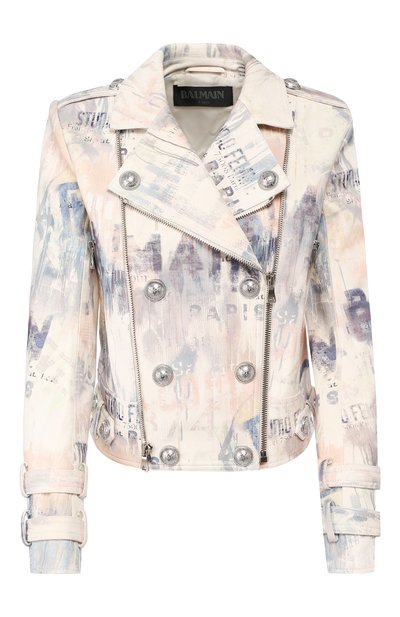 В коллекцию сезона осень-зима вошла куртка, словно раскрашенная разноцветной акварелью, которую слегка размыло дождем. Для создания модели Оливье Рустен выбрал мягкую гладкую кожу. Изделие на молнии и кнопках декорировано фирменными пуговицами с выгравированной символикой бренда, основанного Пьером Бальманом.