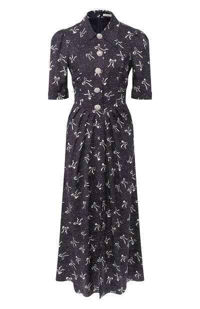 Платье из осенне-зимней коллекции похоже на модели родом из 1940-х: миди-длина, приталенный силуэт, акцентированные плечи и крупные кристальные пуговицы на лифе. Для пошива изделия Алессандра Рич выбрала легкий темно-синий шелковый креп в мелкий белый горох, который разбавили крупные банты.