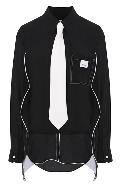 Рикардо Тиши включил в осенне-зимнюю коллекцию рубашку из нежного, приятного на ощупь шелкового крепдешина. Спокойный черный цвет стал идеальным фоном для белого галстука, швов и прямоугольного патча с фамилией Томаса Берберри. Попробуйте, как наши стилисты, собрать монохромный образ в сочетании с брюками и туфлями на шпильке.