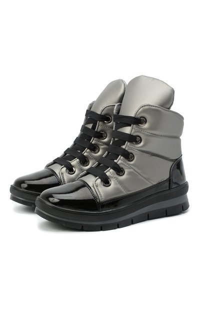 Ботинки из осенне-зимней коллекции — доказательство того, что можно найти компромисс между комфортом и модой. Обувь сшили из прочного серебристого материала с водонепроницаемым покрытием, а отделку выполнили из черного лакированного полимера. Широкая подошва с небольшим протектором делает пару более устойчивой на влажной поверхности, а шерстяная внутренняя отделка согревает ноги.