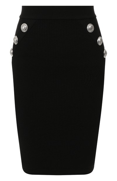 Одежду бренда легко узнать по знаковым серебристым пуговицам с выгравированной эмблемой марки, основанной Пьером Бальманом. Не исключение и черная юбка из мягкой эластичной шерсти. Попробуйте дополнить образ топом в тон и босоножками на высокой шпильке.