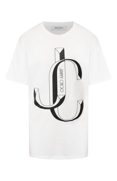 Удлиненная белая футболка вошла в коллекцию сезона осень-зима. Для пошива модели с круглым вырезом мастера марки использовали гладкий хлопок. Такой материал хорошо держит форму, поэтому вещь из него сохраняет свежий вид в течение всего дня. Спереди — крупный черный принт с монограммой в виде инициалов Джимми Чу.