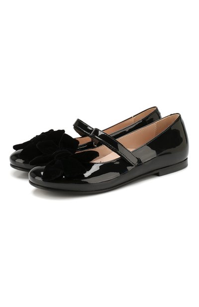 Мастера марки изготовили черные туфли, которые застегиваются узким ремешком велькро на подъеме, из гладкой лаковой кожи. Союзку пары с ортопедической колодкой украсили объемным бантом из шелковистого бархата.