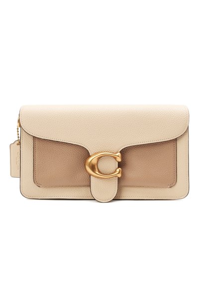Сумка Tabby из весенне-летней коллекции — аксессуар 2-в-1: сняв съемную ручку и плечевой ремень, ее можно носить как клатч. Для пошива модели использовали комбинацию двух оттенков матовой фактурной кожи: кремового и карамельного (вторым подчеркнули плоский накладной карман). Внутрь поместятся кошелек, телефон и паспорт.