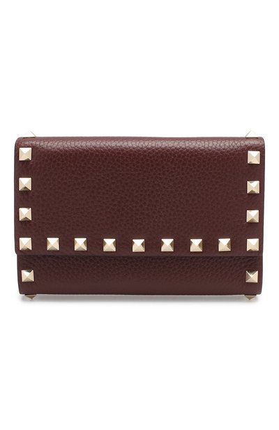 Для создания бордового портмоне мастера марки использовали мягкую матовую кожу с зерненой текстурой. Изделие украсили фирменными шипами-пирамидами с платиновым покрытием, такой декор рифмуется с надписью в виде логотипа бренда сзади. Внутри — отделения для купюр, карман на молнии для монет и слоты для кредитных карт.