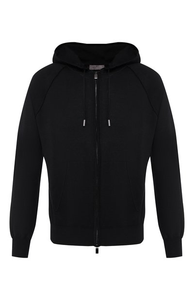 Обычно толстовки шьют из хлопкового футера, но для производства этой черной модели мастера использовали мягкий, приятный на ощупь шерстяной трикотаж. Такой материал хорошо сохраняет тепло благодаря многослойной структуре волокон, но пропускает воздух за счет характерного переплетения нитей. Очищенное от декора изделие вошло в осенне-зимнюю коллекцию.