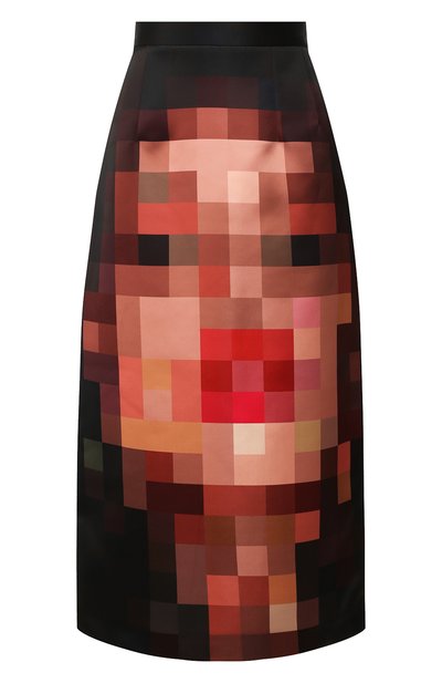 Черная юбка-трапеция из плотного дюшеса с характерным блеском стала холстом для крупного яркого принта Pixel Grace, в котором угадывается лицо девушки. На показе осенне-зимней коллекции такое изделие сочетали с яркой блузой с похожим рисунком и сапогами, а наши стилисты предлагают носить с белыми водолазкой и босоножками.